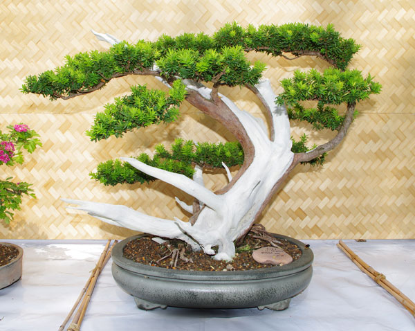 Das schwere und haltbare Holz der Eibe läßt sich ausgezeichnet als Totholz gestalten. Jin (entrindete Äste) und Shari (entrindete Stammteile) erstrahlen nach ausreichender Reife und Behandlung mit einem Bleichmittel silbergrau bis weiß und stehen in einem reizvollen Kontrast zur Rinde, welche nach dem Bürsten eine kräftige rotbraune Farbe aufweist.